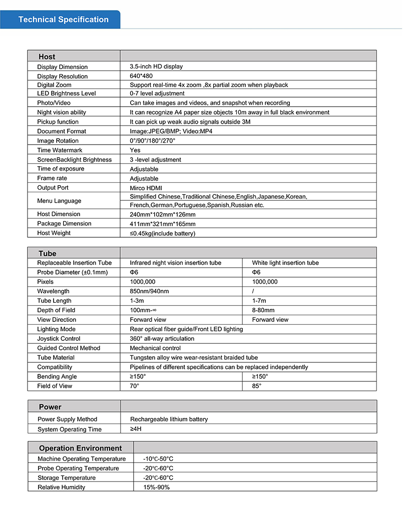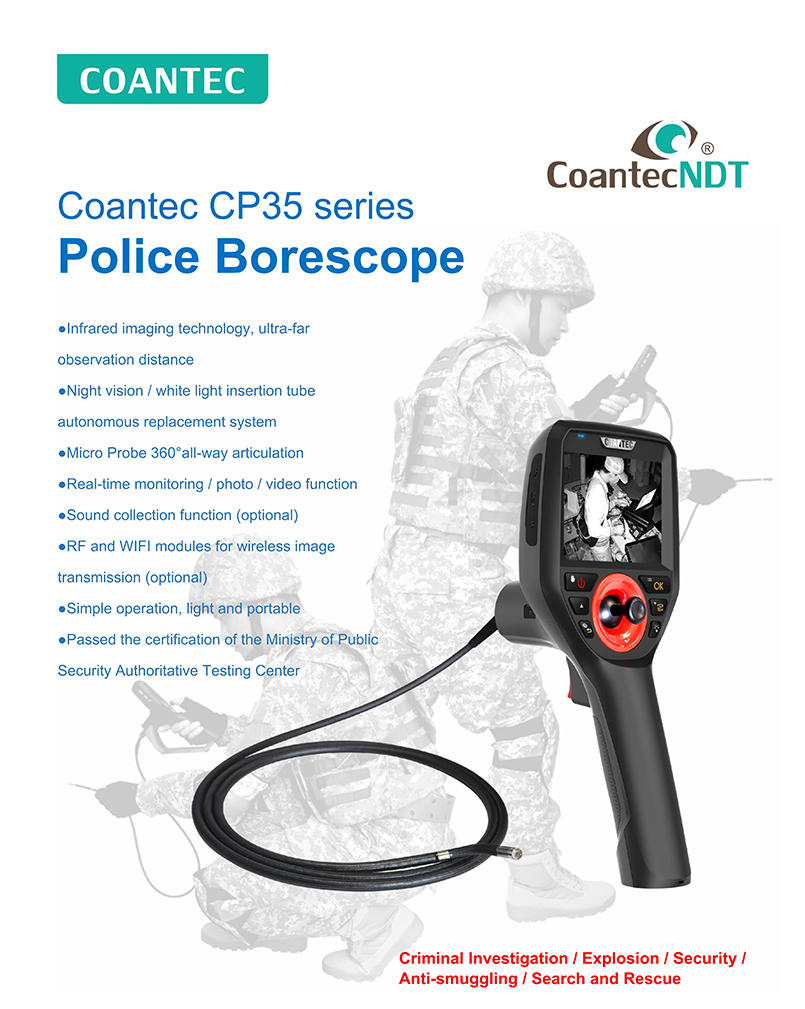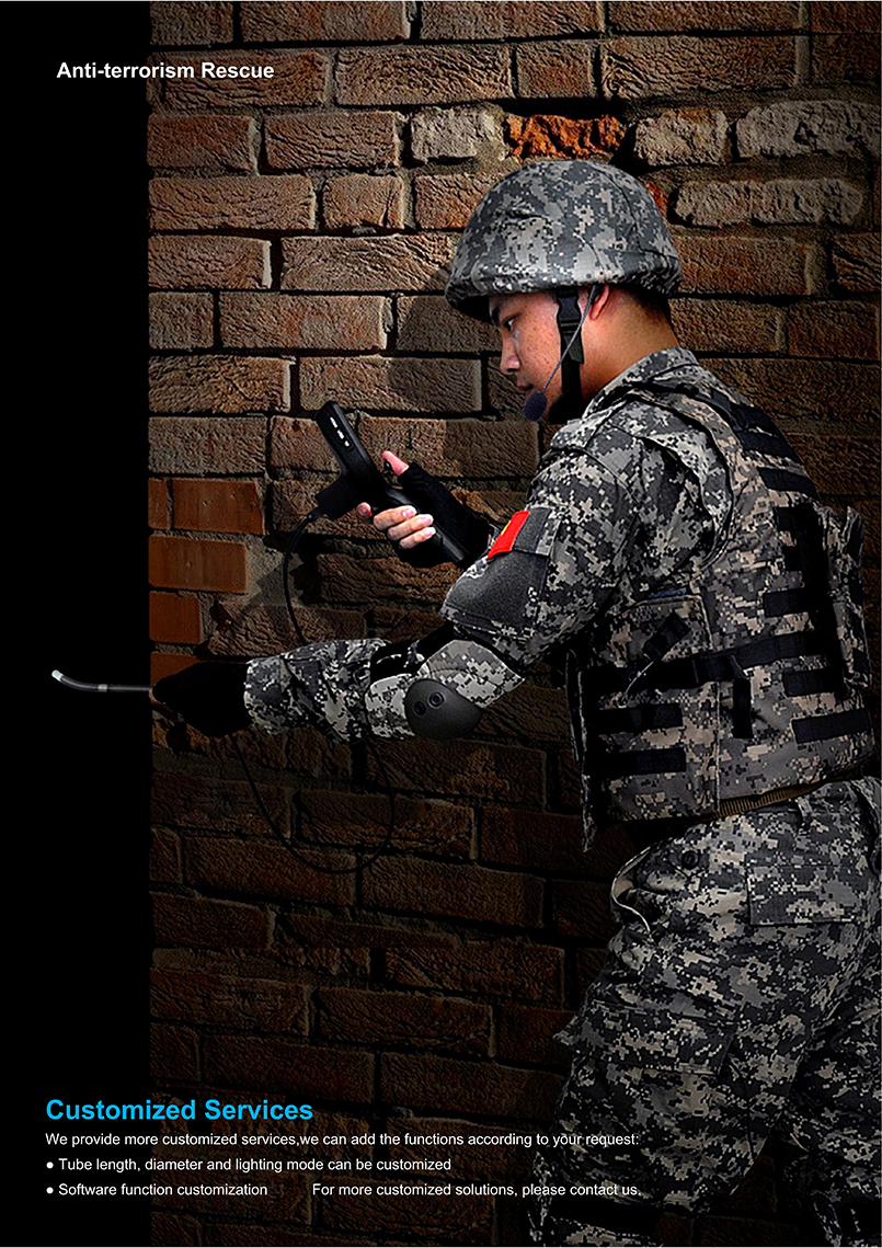 This product is a flexible police borescope with infrared night vision function. The whole machine adopts integrated hand-held design, which is light and portable. The probe can be 360° all-way articulating to observe without dead angle. Users can monitor in real time through the LCD screen, as well as taking photos and recording videos.The optional WIFI module can transmit the collected image data to the mobile terminal for remote monitoring.The products are suitable for public security, armed police, fire, procuratorate, customs and other relevant personnel to carry out criminal investigation, detonation, security inspection, anti-smuggling, search and rescue, etc.