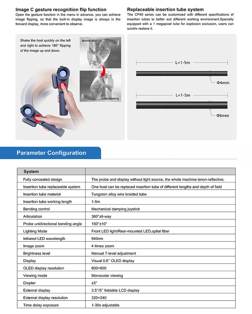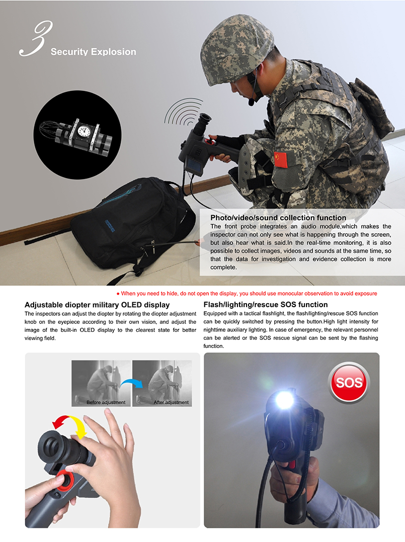 Ifully concealed design、Equipped with a quick-fit foldable display、Photo/video/sound collection function、Image C gesture recognition flip function、Replaceable insertion tube system、Adjustable diopter military OLED display、Flash/lighting/rescue SOS function、Equipped with detachable military shoulder strap