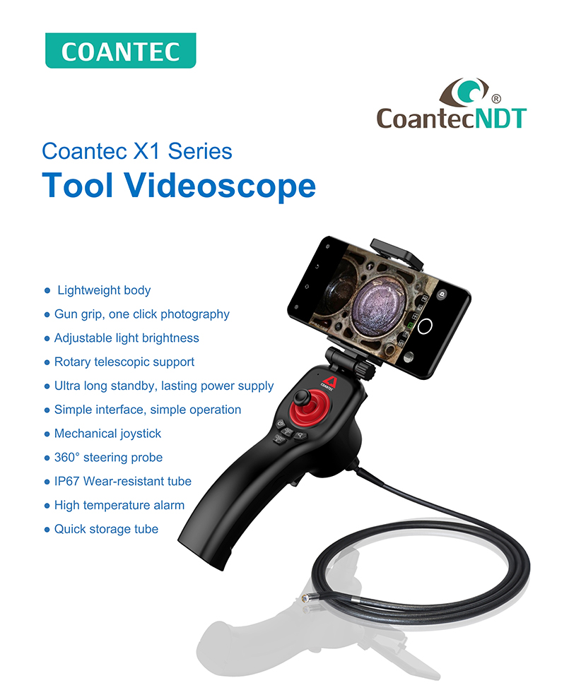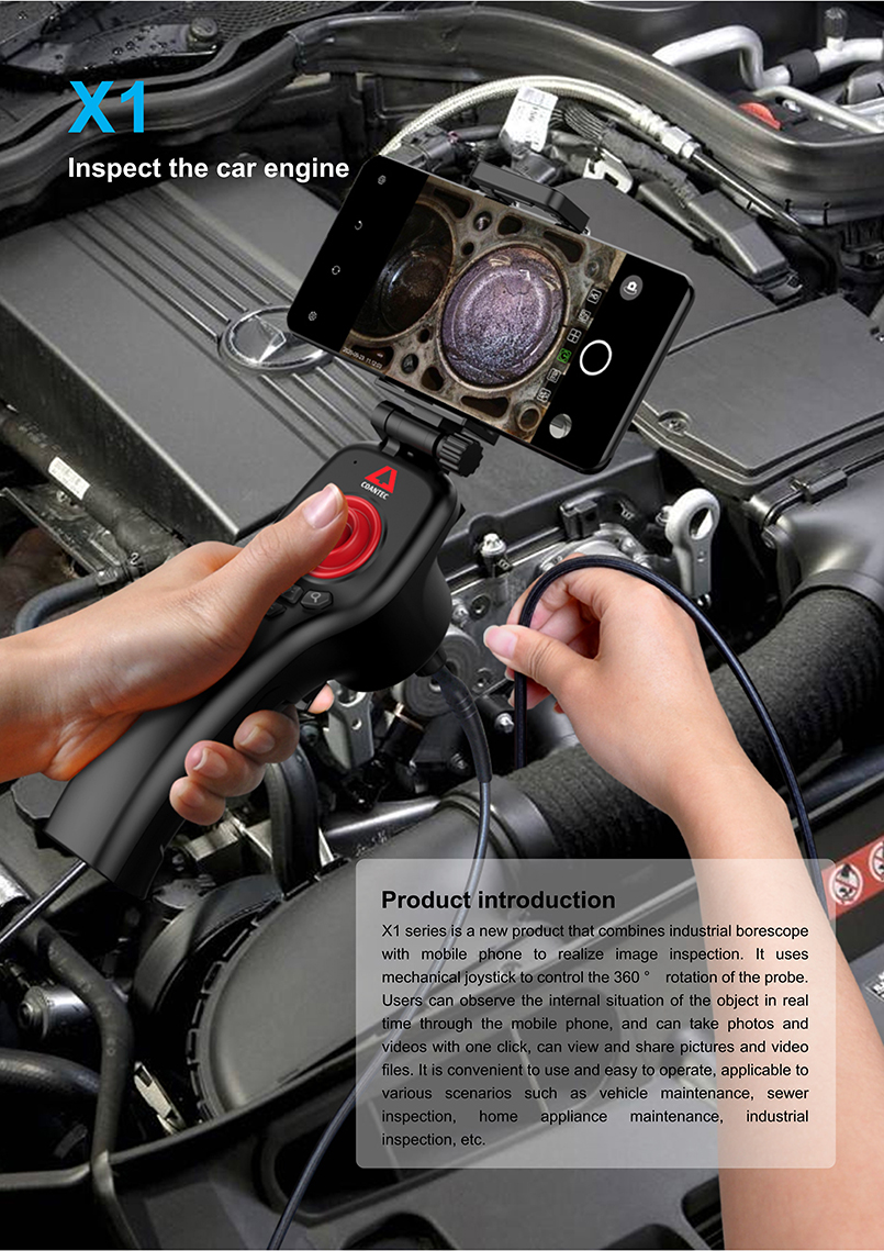 X1 series is a new product that combines industrial borescope with mobile phone to realize image inspection. It uses mechanical joystick to control the 360 ° rotation of the probe. Users can observe the internal situation of the object in real time through the mobile phone, and can take photos and videos with one click, can view and share pictures and video files. It is convenient to use and easy to operate, applicable to various scenarios such as vehicle maintenance, sewer inspection, home appliance maintenance, industrial inspection, etc.